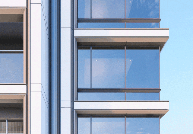 对于社区塑制,采用公建化极简美学,项目从保守灰白色的公建化立面得以进化,采用豪宅御用的铝板+双层LOW-E巨幕玻璃组合,是点睛之笔,选用更低密的「凹凸配组合」(高层搭配小高层洋房),仅仅这一点角度改变,